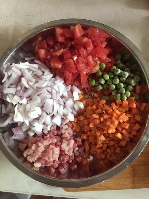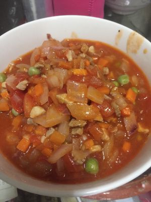油锅下肉沫 蔬菜丁 加入番茄酱 翻炒