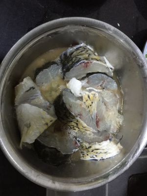 锅中加入油,把鱼骨鱼头煎一下。倒入开水,加入料包,蔬菜。