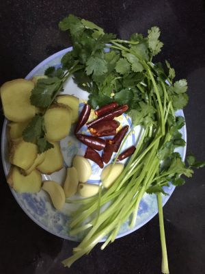 姜切片,蒜拍下,干辣椒切段,香菜切段
