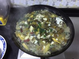 下酸菜翻炒几分钟后,加适量水,把之前炸过的鱼骨放下去,汤沸腾之后,把酸菜和鱼骨捞出来垫在盘底,然后把腌制的鱼肉倒入汤中(可以放一点嫩豆腐下去,切大块,嫩豆腐加酸辣的汤汁,超级美味),熟了之后把汤和鱼肉倒在酸菜上!