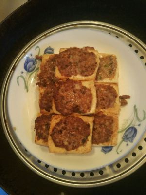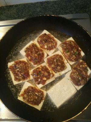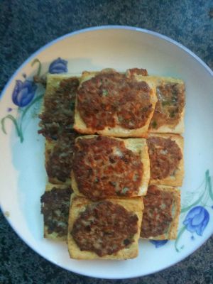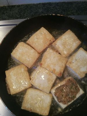 先把豆腐切块,用小勺在中间挖个洞,将肉末装进豆腐中间,下油锅煎至五成熟,出锅。