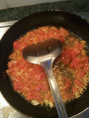 平底锅里放少许油,油热放入蒜沫炒香,放入西红柿熬制三分钟。放入盐,鸡精调味。