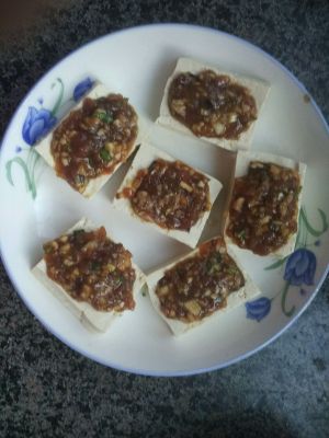 用小刀或者勺子把中间的豆腐挖掉,香菇剁成碎碎,葱切成葱花,姜剁姜沫。