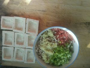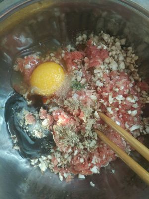 拌馅(放少许盐,少许胡椒粉,一个鸡蛋,适量耗油,顺时针搅拌)