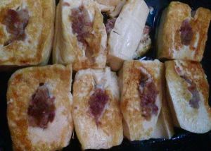 将煎好的豆干冷却后用小刀在中间隔开,挖出中间的豆腐,动作要轻,不要将豆腐挖破。准备将调好的猪瘦肉塞入豆干中。