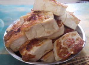 热锅倒入油,豆腐正面朝下放入锅煎至金黄~