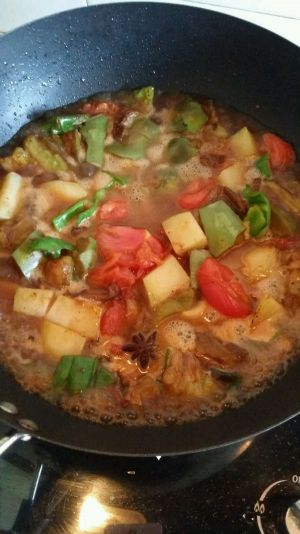 锅内倒油,茄子比较吸油,一般我会多放点。加入花椒、大料、葱姜蒜爆香,下牛肉,炒至变色,分别加入茄子、土豆、辣椒、西红柿,翻炒2分钟,加入适量老抽、十三香,再翻炒两三分钟,加入水,不用太多,将将末过食材即可。大火炖开。然后中小火继续炖,待汤汁收至差不多后加入盐、味精,再炖一两分钟,汤汁粘稠将干即可出锅。