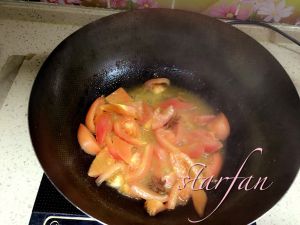 待西红柿软了,开始上色放入掰好的茄子翻炒一会儿后加入阿迪锅中的骨头汤,如果爱喝汤可多加些。阿迪锅里的姜和大料瓣可继续使用。
