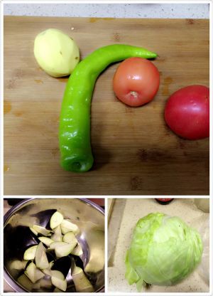 土豆、茄子、尖椒切成滚刀块,西红柿切成小块(这样比较容易出汤)大头菜写成条状,五花肉切成片
