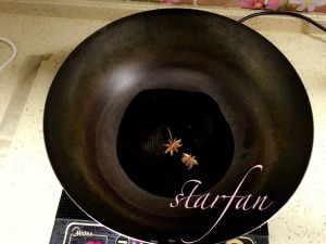炒锅到油烧热爆香葱姜,大料和桂皮。