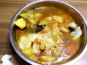 接着放入茄子、土豆,大头菜,加入酱油,盐,水没过大头菜即可