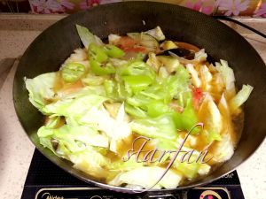 加粉条木耳一起煮五分钟,加娃娃菜青椒番茄一起煮10分钟加盐鸡精出锅