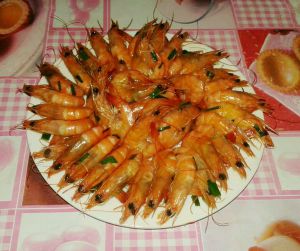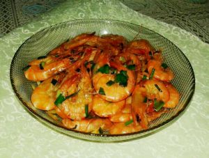 热油锅爆香切片的姜蒜,下干净的虾,炒变红后放酱油,耗油,盐,出盘,撒葱和蒜叶