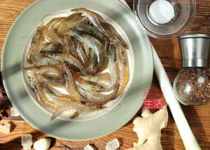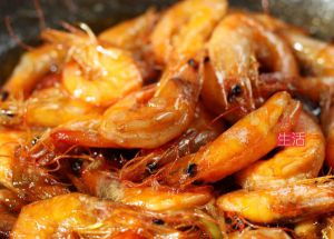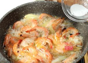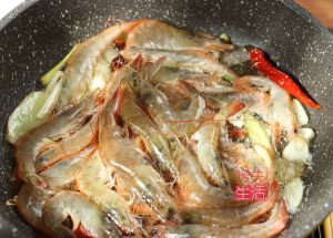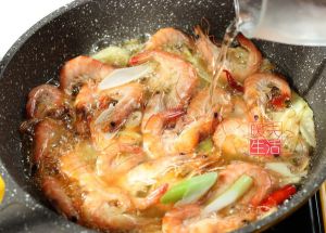 不停的翻炒,等到虾表面都变色后,加入清水,水位不要高出虾就可以。