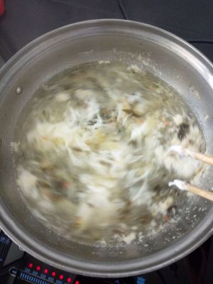 水开后依次倒入面粉水,鸡蛋糊,紫菜,煮沸就好。注意水开后倒入面粉水,再开锅后倒入鸡蛋糊,再开锅放入紫菜哈!一定要水开再进行下一步哦!