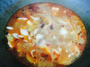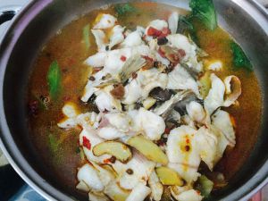 提前煮好蔬菜(8成熟)晾在一边,并将码好味的鱼块加水在锅中煮