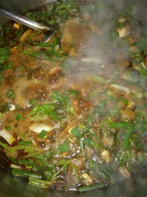 煮到两分钟之后放少许的 ,芹菜,葱,香菜,不要放完,留一点后面还要用。