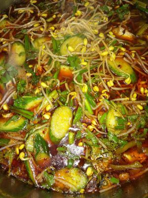 煮到水涨了之后放黄瓜豆芽进去煮,煮几分钟之后,就可以了。