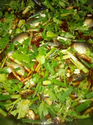 锅里重新加入油 小火 花椒干辣椒放入 香味出来 捞出放入鱼肉中 锅里余油 大火 再到在花椒小葱上 香味马上出来!