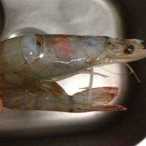 海白虾选大个儿的,拿剪子剪掉虾枪,头千万千万要留着,要不就不好吃啦