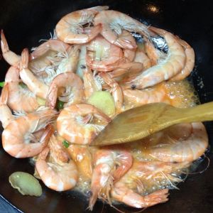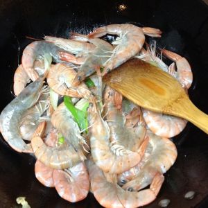 锅中热油,可多放些油,下葱白,姜蒜炒香,放入大虾煎至外皮酥脆