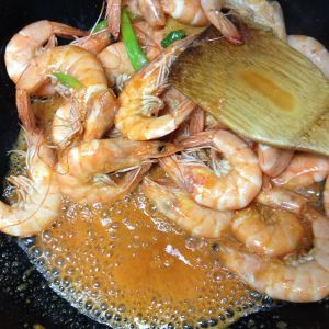 根据自己的口味把葱姜蒜,生抽,糖,番茄酱一起放在碗里,加开水,用勺调均匀后倒入煎好的虾上,盖锅盖焖3~5分钟,待汁收的差不多就OK了