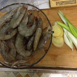大虾剪须去肠线清洗干净后,加入料酒,盐,姜片,葱段,腌制入味,约需30分钟。