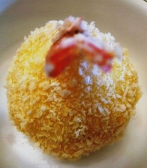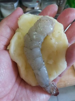 用土豆泥把虾肉部分包成球状