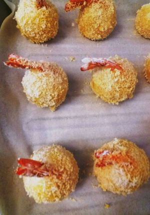 将土豆圆球按扁,放一只虾肉在土豆泥上,虾尾在外面