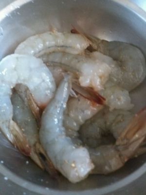 新鲜基围虾,去头剥壳,留一点点尾巴,到时比较好看,提前放点盐、白胡椒粉、料酒腌制一会儿