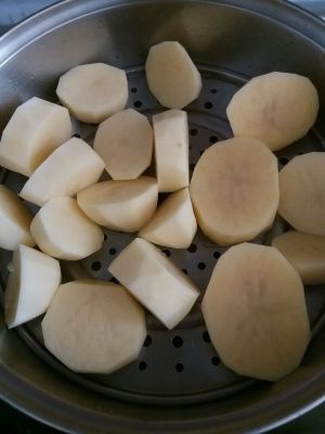 土豆切块,上锅蒸熟。记得千万不要水煮。不然土豆太软没法黏