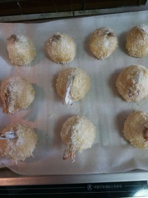 烤盘里放好锡纸,把裹好面包屑的凤尾虾平铺后放入烤箱,烤虾功能12分钟后就可以了
