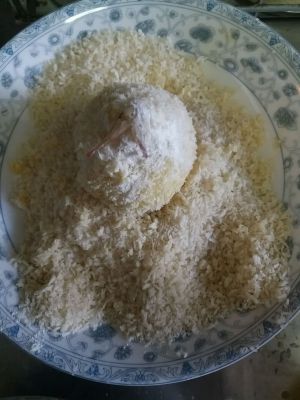 裹好蛋液的凤尾虾在炒好的面包屑里翻滚,尽量面包屑包裹好大虾