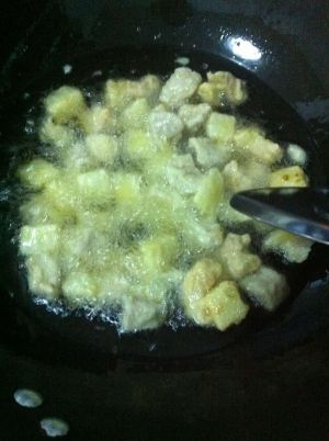 捞出的肉粒,稍放2分钟,再放回油锅里复炸1分钟捞出备用;