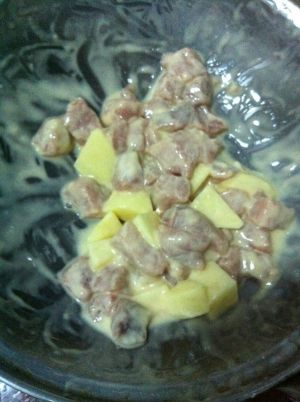 將瘦肉和土豆切小块加入鹽和味精醃至10分鐘。