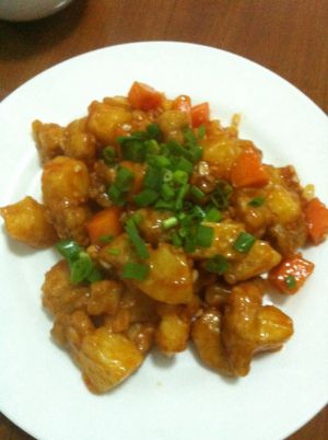 另起炒锅加入少许多力浓香花生油,小火煸炒蒜末姜末; 再下2勺番茄酱、2勺香醋、2勺白糖、1勺生抽、4勺清水、2g盐,最后用少许淀粉调稀勾芡