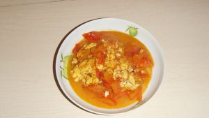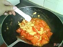倒入少量的油,把鸡蛋均匀地洒在锅里,的鸡蛋膨胀后放入西红柿翻炒。接着,加入味精、盐、生抽。