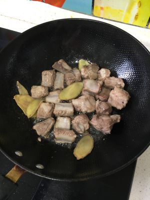 锅烧热,多油,姜煸香,倒入排骨翻炒至金黄色。
