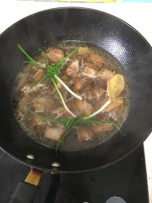 依次加入:黄酒1勺,生抽2勺,醋3勺,糖4勺。一次加入没过排骨的开水。盖锅烧开后,中小火煨近半个小时。