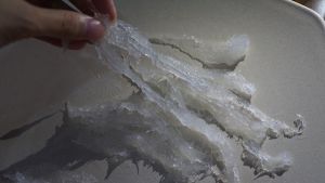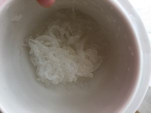 挑毛 把燕窝沿纹理撕成一条一条,放到水里把残留的一点小毛毛挑出来,毕竟都是手工挑毛,不可能一根残留的毛都没有~这个过程多换几次水,冲干净就好啦。