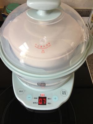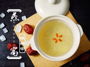 上锅 我用的就是普通电饭锅,下面架一个架子,加水到没过炖盅一半的位置,待水煮沸,将炖盅放进去,炖三四十分钟即可,出锅前十分钟把冰糖和枸杞放进去。如果你用瓷碗记得上面盖个盘子什么的~,不要让容器直接接触电饭锅内壁哦,小心炸裂。