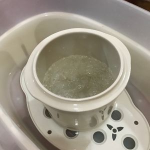 放到玻璃盅里面,纯净水没过燕窝。开始炖。我是用的机器,直接设定的时间。其他的小伙伴,隔水炖半小时,炖出来之后加冰糖等调味。