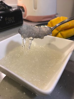 冰糖融化后加入一盒椰果罐头(60g/盒)搅拌均匀即可关火 加几粒洗净的枸杞 焖至凉透即可食用 我觉得冰镇后口感更好一些