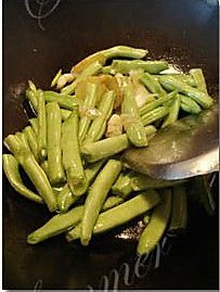 放入扁豆翻炒均匀,放入炒过的肉片,继续炒至半熟;
