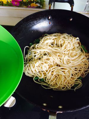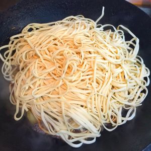炒锅中加盐和适量的水,水沸后关火,放入蒸过的面条,搅拌均匀,开大火煮沸后,中小火继续煮七八分钟,大火收汁即可。