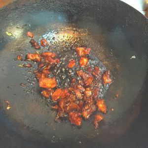 放入肉片翻炒至变色放酱油上色