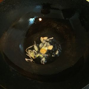 接着在炒锅中倒入少许底油,油温四五成热时放入葱姜片炝一下锅