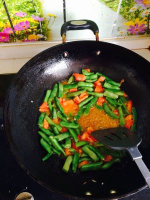 翻炒豆角,西红柿。有鸡蛋的可以一起放进去,扁豆四分熟后将炒好的葱姜蒜之类放进去