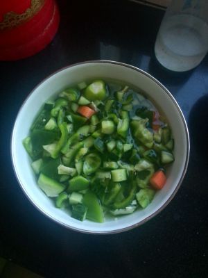 在油锅里爆炒葱花后炒肉,然后放入所有青菜,翻炒五分钟之后加入佐料和人工肠,再翻炒三分钟装盘