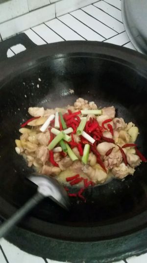 所有鸡块上色后放入红辣椒、八角、蒜,继续翻炒